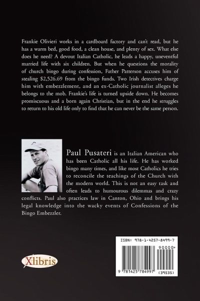 Frankie Olivieri works in a cardboard factory and can't read, but he has a warm bed, good food, a clean house, and plenty of sex. What else does he need? A devout Italian Catholic, he leads a happy, uneventful married life with six children. But when he questions the morality of church bingo during confession, Father Patterson accuses him of stealing $2,526.69 from the bingo funds. Two Irish detectives charge him with embezzlement, and an ex-Catholic journalist alleges he belongs to the mob. Frankie's life is turned upside down. He becomes promiscuous and a born again Christian, but in the end he struggles to return to his old life only to find that he can never be the same person.