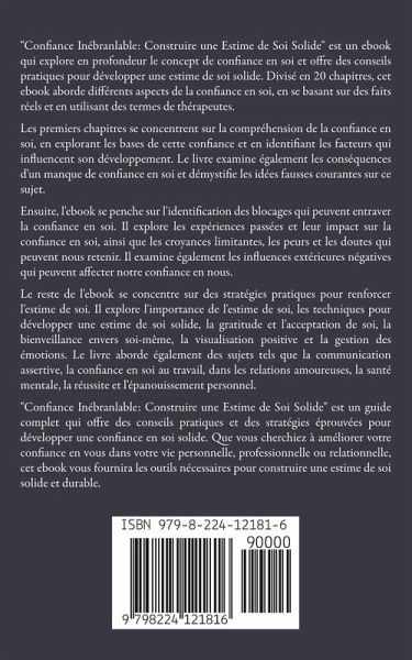 "Confiance Inébranlable: Construire une Estime de Soi Solide" est un ebook qui explore en profondeur le concept de confiance en soi et offre des conseils pratiques pour développer une estime de soi solide. Divisé en 20 chapitres, cet ebook aborde différents aspects de la confiance en soi, en se basant sur des faits réels et en utilisant des termes de thérapeutes. Les premiers chapitres se concentrent sur la compréhension de la confiance en soi, en explorant les bases de cette confiance et en identifiant les facteurs qui influencent son développement. Le livre examine également les conséquences d'un manque de confiance en soi et démystifie les idées fausses courantes sur ce sujet. Ensuite, l'ebook se penche sur l'identification des blocages qui peuvent entraver la confiance en soi. Il explore les expériences passées et leur impact sur la confiance en soi, ainsi que les croyances limitantes, les peurs et les doutes qui peuvent nous retenir. Il examine également les influences extérieures négatives qui peuvent affecter notre confiance en nous. Le reste de l'ebook se concentre sur des stratégies pratiques pour renforcer l'estime de soi. Il explore l'importance de l'estime de soi, les techniques pour développer une estime de soi solide, la gratitude et l'acceptation de soi, la bienveillance envers soi-même, la visualisation positive et la gestion des émotions. Le livre aborde également des sujets tels que la communication assertive, la confiance en soi au travail, dans les relations amoureuses, la santé mentale, la réussite et l'épanouissement personnel. "Confiance Inébranlable: Construire une Estime de Soi Solide" est un guide complet qui offre des conseils pratiques et des stratégies éprouvées pour développer une confiance en soi solide. Que vous cherchiez à améliorer votre confiance en vous dans votre vie personnelle, professionnelle ou relationnelle, cet ebook vous fournira les outils nécessaires pour construire une estime de soi solide et durable.