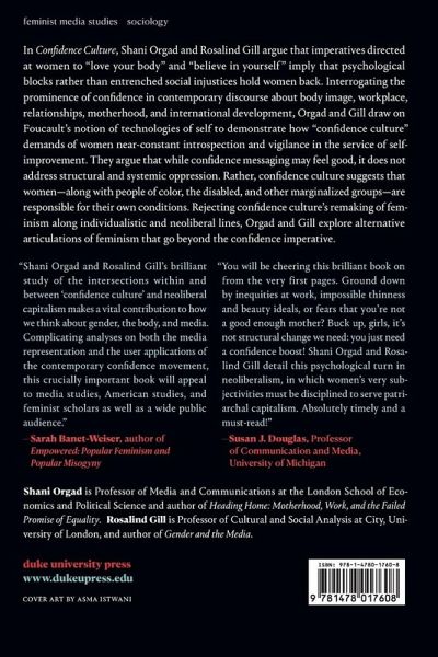 In Confidence Culture, Shani Orgad and Rosalind Gill argue that imperatives directed at women to "love your body" and "believe in yourself" imply that psychological blocks rather than entrenched social injustices hold women back. Interrogating the prominence of confidence in contemporary discourse about body image, workplace, relationships, motherhood, and international development, Orgad and Gill draw on Foucault's notion of technologies of self to demonstrate how "confidence culture" demands of women near-constant introspection and vigilance in the service of self-improvement. They argue that while confidence messaging may feel good, it does not address structural and systemic oppression. Rather, confidence culture suggests that women-along with people of color, the disabled, and other marginalized groups-are responsible for their own conditions. Rejecting confidence culture's remaking of feminism along individualistic and neoliberal lines, Orgad and Gill explore alternative articulations of feminism that go beyond the confidence imperative.