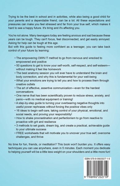 Confidence for Teens Is UnlockedEmpowering Youth To Fit Into Their Environment, Relieve Them From Social Pressures of Life and To Feel More Comfortable In Their Own Skin! By Dr. Emma Sky Every morning you wake up it feels like someone else is out there to hit you with an all-new level of stress and pressure. The teenage years shouldn't be like this-and you have the power to change it! You have to be the best in class and in extracurricular activities. You need to be the model child for your parents and the rock for your friends. You should dress the part, have the followers, and do it all with a smile! Every 'should', 'need', and 'have-to' piles on the stress and pulls you further away from your authentic self. The more lost you feel, the harder it is to picture a future that excites you. It's a lot of effort and it's taking its toll! Have you noticed that despite being exhausted, you can't sleep? Are your grades starting to suffer? Overall, do you just look at yourself and not like what you see? Sadly, you aren't alone. After some incredibly turbulent years, teens today are suffering from anxiety and depression. They are disengaged, can't concentrate, and are irritable. But they are also at an age where asking for help is hard. But with this guide to becoming a confident teenager, you can take control of your own future by discovering: * The empowering OWN IT method to go from nervous and wrecked to empowered and positive * 50 questions to get to know your self-worth, self-respect, and self-esteem- without making it feel like homework * The best anatomy session you will ever have to understand the brain and body connection, and why this is fundamental for your well-being * What your emotions are trying to tell you and how to process them through creative outlets * The art of effective, assertive communication-even for the hardest conversations * One nerve that has been scientifically proven to reduce stress, anxiety, and panic-with no medical equipment or training! * A step-by-step guide to turning your overbearing negative thoughts into useful power rephrases without forcing the positive vibes only * 16 ideas to begin self-care, taking control of your physical, emotional, and social needs, and proving your responsibility! * How to shake procrastination and perfectionism to go from reactive to proactive with grit and resilience * 3 methods to set goals, dream big, and create a practical, achievable guide to your ultimate success * FREE worksheets that will motivate you to uncover your true self, overcome challenges, and thrive And much more. You already have a ton of work to do, you don't have time for fun and friends, let alone for some mindful meditation in nature! This book isn't going to add to your workload and pressure. The dozens of practical, proven techniques can be adapted for your needs anytime, anywhere, whether on a treadmill or a bus, whether you have 5 minutes or 50. Each moment you dedicate to helping yourself will be a little less weight on your shoulders and a little more fun!