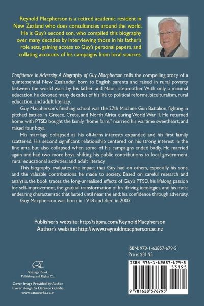 Confidence in Adversity: A Biography of Guy Macpherson tells the compelling story of a quintessential New Zealander born to English parents and raised in rural poverty between the world wars by his father and Maori stepmother. With only a minimal education, he devoted many decades of his life to political reforms, biculturalism, rural education, and adult literacy. Guy Macpherson's finishing school was the 27th Machine Gun Battalion, fighting in pitched battles in Greece, Crete, and North Africa during World War II. He returned home with PTSD, bought the family "home farm," married his wartime sweetheart, and raised four boys. His marriage collapsed as his off-farm interests expanded and his first family scattered. His second significant relationship centered on his strong interest in the fine arts, but also collapsed when some of his campaigns ended badly. He married again and had two more boys, shifting his public contributions to local government, rural educational activities, and adult literacy. This biography evaluates the impact that Guy had on others, especially his sons, and the valuable contributions he made to society. Based on careful research and analysis, the book traces the long-unrealized effects of Guy's PTSD, his lifelong passion for self-improvement, the gradual transformation of his driving ideologies, and his most endearing characteristic that lasted until near the end: his confidence through adversity. Guy Macpherson was born in 1918 and died in 2003. Reynold Macpherson is a retired academic resident in New Zealand who does consultancies around the world. He is Guy's second son, who compiled this biography over many decades by interviewing those in his father's role sets, gaining access to Guy's personal papers, and collating accounts of his campaigns from local sources. Author's website: http://www.reynoldmacpherson.ac.nz