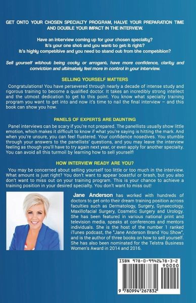Selling Yourself Matters Congratulations! You have persevered through nearly a decade of intense study and rigorous training to become a qualified doctor. It takes an incredibly strong intellect and the utmost dedication to get to this point. You know what specialty training program you want to get into and now it's time to nail the final interview - and this book can show you how. Panels of Experts are Daunting Panel interviews can be scary if you're not prepared. The panellists usually show little emotion, which makes it difficult to know if what you're saying is hitting the mark. And when you're unsure, you can feel flustered. Your confidence nosedives. You stumble through your answers to the panellists' questions, and you may leave the interview feeling as though you'll have to try again next year, or even apply for another specialty. You can avoid all this turmoil by learning how to sell yourself! How Interview Ready Are You? You may be concerned about selling yourself too little or too much in the interview. What amount is just right? You don't want to appear boastful or brash, but you also don't want to miss out on your training program. This is your chance to achieve a training program in your desired specialty. You don't want to miss out! We all hate selling ourselves, but an interview is one of those times when you can't be shy. You have to stand out from the crowd, of course, but there's a way to give the panellists what they want to hear without sounding like you're blowing your own trumpet. From this book you will learn: What the interview panel wants to hear. Specific clinical, technical skills you need to sell yourself effectively. How to craft your answers so they demonstrate that you're the best person for the job. A framework to build effective answers to medical behavioural, scenario and ethical questions. Techniques to increase your confidence, how to anticipate what questions the panel might ask and how to practice in the lead up to the big day. About the Author: Jane Anderson has worked with hundreds of doctors to get onto their dream training position across faculties such as dermatology, surgery, gynaecology, maxillofacial surgery, cosmetic surgery and urology. She has been featured in various national print and television media, speaks at conferences and mentors individuals. She is the host of the number 1 ranked iTunes podcast, the "Jane Anderson Brand You Show", and is the author of three books on how to sell yourself. She has also been nominated for the Telstra Business Women's Award in 2014 and 2016.