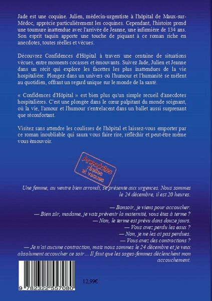 Jade est une coquine. Julien, médecin-urgentiste à l'hôpital de Maux-sur-Médoc, apprécie particulièrement les coquines. Cependant, l'histoire prend une tournure inattendue avec l'arrivée de Jeanne, une infirmière de 134 ans. Son esprit taquin apporte une touche de piquant à ce roman riche en anecdotes, toutes réelles et vécues. Découvrez Confidences d'Hôpital à travers une centaine de situations vécues, entre moments cocasses et émouvants. Suivez Jade, Julien et Jeanne dans un récit qui explore les facettes les plus inattendues de la vie hospitalière. Plongez dans un univers où l'humour et l'humanité se mêlent au quotidien, offrant un regard unique sur le monde de la santé. « Confidences d'Hôpital » est bien plus qu'un simple recueil d'anecdotes hospitalières. C'est une plongée dans le coeur palpitant du monde soignant, où la vie, l'amour et l'humour s'entrelacent dans un ballet aussi surprenant que réconfortant. Visitez sans attendre les coulisses de l'hôpital et laissez-vous emporter par ce roman inoubliable qui saura vous faire rire, réfléchir et peut-être même vous émouvoir.