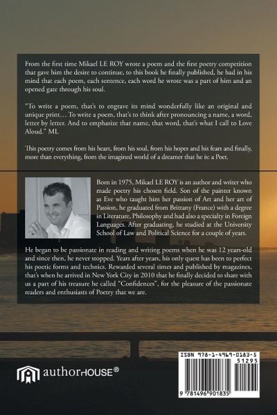 From the first time Mikael LE ROY wrote a poem and the first poetry competition that gave him the desire to continue, to this book he finally published, he had in his mind that each poem, each sentence, each word he wrote was a part of him and an opened gate through his soul. "To write a poem, that's to engrave its mind wonderfully like an original and unique print... To write a poem, that's to think after pronouncing a name, a word, letter by letter. And to emphasize that name, that word, that's what I call to Love Aloud." ML This poetry comes from his heart, from his soul, from his hopes and his fears and finally, more than everything, from the imagined world of a dreamer that he is: a Poet.