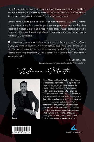 Eliecer Marte, periodista y presentador de televisión, comparte su historia en este libro y revela sus secretos más íntimos y personales, incluyendo su salida del clóset ante el público, así como su proceso de aceptación y descubrimiento personal. Confidencias es una obra que va más allá de la orientación sexual o la identidad de género. Es una historia de triunfo y evolución que ofrece una perspectiva valiosa sobre cómo encontrar la felicidad y el éxito en la vida sin comprometer nuestra esencia. Es un libro sincero y emotivo, una historia inspiradora que nos invita a encontrar nuestro propio camino hacia la autenticidad. La historia de Eliecer abarca desde su infancia en el Caribe, su paso por Nueva York y Miami, sus logros periodísticos y reconocimientos, hasta su entrada triunfal por la alfombra roja con su pareja. Nos hace reflexionar sobre los obstáculos que la sociedad o nosotros mismos nos imponemos, y cómo la tenacidad y la valentía son el mejor camino para superarlos. ¿-Carlos Calderón Abarca ¿ Presentador televisivo, ganador de los premios Emmy, arquitecto
