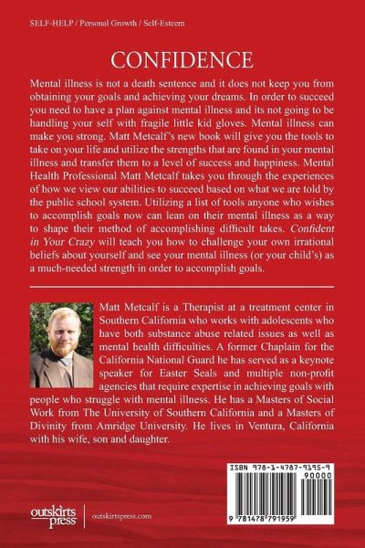Mental illness is not a death sentence and it does not keep you from obtaining your goals and achieving your dreams. In order to succeed you need to have a plan against mental illness and its not going to be handling your self with fragile little kid gloves. Mental illness can make you strong. Matt Metcalf's new book will give you the tools to take on your life and utilize the strengths that are found in your mental illness and transfer them to a level of success and happiness. Mental Health Professional Matt Metcalf takes you through the experiences of how we view our abilities to succeed based on what we are told by the public school system. Utilizing a list of tools anyone who wishes to accomplish goals now can lean on their mental illness as a way to shape their method of accomplishing difficult takes. Confident in Your Crazy will teach you how to challenge your own irrational beliefs about yourself and see your mental illness (or your child's) as a much-needed strength in order to accomplish goals.