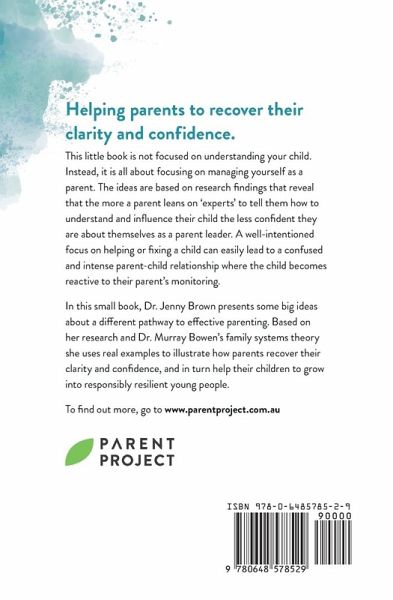 CONFIDENT PARENTING HELPING PARENTS TO RECOVER THEIR CLARITY AND CONFIDENCE This little book is not focused on understanding your child. Instead, it is all about focusing on managing yourself as a parent. The ideas are based on research findings that reveal that the more a parent leans on 'experts' to tell them how to understand and influence their child the less confident they are about themselves as a parent leader. A well-intentioned focus on helping or fixing a child can easily lead to a confused and intense parent-child relationship where the child becomes reactive to their parent's monitoring. In this small book, Dr. Jenny Brown presents some big ideas about a different pathway to effective parenting. Based on her research and Dr. Murray Bowen's family systems theory she uses real examples to illustrate how parents recover their clarity and confidence, and in turn help their children to grow into responsibly resilient young people. This book contains experts from Dr. Brown's best-selling book: Growing Yourself Up (Exilse Publishing) Further parenting resources: www.parentproject.com.au