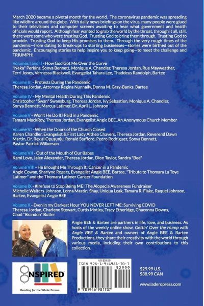 March 2020 became a pivot month for the world. The coronavirus pandemic was spreading like wildfire around the globe. With daily news briefings on the virus, many people were glued to their televisions and computer screens awaiting to hear what government and health officials would report. Although fear wanted to grab the world by the throat, through it all, still, there were some who were trusting God. Trusting God to bring them through. Trusting God to provide. Trusting God to keep His promises to them. Through the very rough times of the pandemic-from dating to break-ups to starting businesses-stories were birthed out of the pandemic. Encouraging stories to help inspire you to keep going-to meet the challenge and TRIUMPH! Volumes I and II - How God Got Me Over the Curve "Neka" Perkins, Sonya Bennett, Terri Jones, Monique Chandler, Rue Mayweather, Theresa Jordan, Vernessa Blackwell, Tahara Lee, Thaddeus Randolph, Bartee Volume III - Protests During the Pandemic Regina Nunnally, Theresa Jordan, Donna M. Gray-Banks, Bartee, Sonya Bennett Volume IV - My Mental Health During This Pandemic Christopher "Swan" Swansburg, Theresa Jordan, Ivy Sebastien, Monique Chandler, Sonya Bennett, Marcus Latimer, Dr. April L. Johnson Volume V - Won't He Do It? PAID IN A PANDEMIC Tamara Mackroy, Theresa Jordan, An Anonymous Church Member Volume VI - When the Doors of the Church Closed Bishop Rex al Opusunju, Pastor Karen Chandler, Evangelist & First Lady Althea Chavers, Pastor Patrick Wilkerson, Ronald Stafford, Pedro Rodriguez, Sonya Bennett Volume VII - Out of the Mouths of Our Babes Kami Love (age 9), Sandra "Bee" (age 8), Jalen Alexander (age 15), Dion Taylor (age 16) Volume VIII - He Brought Me Through it: Cancer in a Pandemic Angie Cowan, Sharlyne Thomas, Bartee, Sonya Bennett, Tanya Bennett, Al James Bennett, Barbara Latimer Volume IX - #Irefuse to Stop Being ME! The Alopecia Awareness Fundraiser Michelle Walters-Johnson, Raquel Johnson, Lorna Mastin, Shay, Uniqua Leak, Tamara Flake, Evangelist Angie BEE, Bartee Volume X - Even in My Darkest Hour YOU NEVER LEFT ME: Surviving Covid Charlene Stewart, Curtis Motley, Chad "Brandon" Butler, Chaconna Downs, Tracy Etheridge