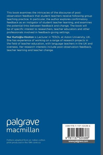 This book examines the intricacies of the discourse of post-observation feedback that student teachers receive following group teaching practice. In particular, the author explores confirmatory feedback as an instigator of student teacher learning, and examines the potential links between feedback and change. The book will be of specific interest to researchers, teacher educators and other professionals involved in feedback-giving settings.