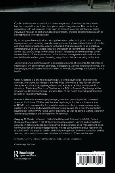 Carol A. Ireland is a chartered psychologist, forensic psychologist and chartered scientist. She works for Mersey Care NHS Trust, where she is lead for sex offender therapies and crisis (hostage) negotiation, and acts as an advisor in crisis/conflict situations. She is also Director of Studies for the MSc in Forensic Psychology at the University of Central Lancashire, and Vice-Chair of the British Psychological Societies Division of Forensic Psychology. Martin J. Fisher is a Forensic Psychologist, chartered psychologist and chartered scientist. Until June 2009 he was the Area Psychologist for South Central area of NOMS, with responsibility for specialist services including drugs strategy, safer custody, mental and physical health service provision. He is now a Consultant Forensic Psychologist in the NOMS HR Directorate and an Honorary Forensic Psychologist in the NHS, as well being a visiting lecturer in Forensic Psychology at the University of Portsmouth. He has been an HMPS Negotiation Advisor since the early 1990s. Gregory M. Vecchi is the unit chief of the Behavioral Science Unit (BSU), Federal Bureau of Investigation (FBI). Dr. Vecchi conducts research, training, and consultation activities in behavior-based conflict analysis and resolution, crisis management, crisis communication, and global hostage-taking. He has conducted extensive research and is published in the areas of conflict and crisis management and communication and he teaches, trains, and consults executive law enforcement officers on the topic.