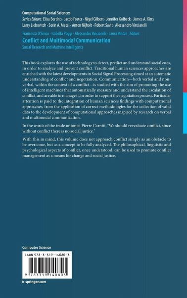 This book explores the use of technology to detect, predict and understand social cues, in order to analyze and prevent conflict. Traditional human sciences approaches are enriched with the latest developments in Social Signal Processing aimed at an automatic understanding of conflict and negotiation. Communication-both verbal and non-verbal, within the context of a conflict-is studied with the aim of promoting the use of intelligent machines that automatically measure and understand the escalation of conflict, and are able to manage it, in order to support the negotiation process. Particular attention is paid to the integration of human sciences findings with computational approaches, from the application of correct methodologies for the collection of valid data to the development of computational approaches inspired by research on verbal and multimodal communication.