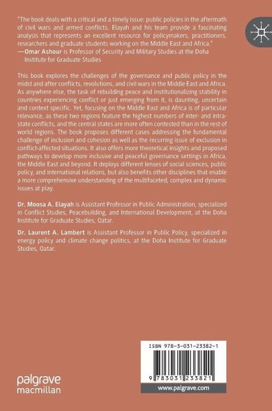 This book explores the challenges of the governance and public policy in the midst and after conflicts, revolutions, and civil wars in the Middle East and Africa. As anywhere else, the task of rebuilding peace and institutionalizing stability in countries experiencing a conflict or just emerging from it is daunting, uncertain and context specific. Yet, focusing on the Middle East and Africa is of particular relevance, as these two regions feature the highest numbers of inter- and intra-state conflicts on the one hand, and the central states are more often contested than in the rest of world regions. The first half of the book proposes different cases addressing the fundamental challenge of inclusion and cohesion as well as the recurring issue of exclusion in conflict-affected situations, with four different cultural and institutional settings. The second half of the book offers more theoretical insights and proposed pathways to develop more inclusive and peaceful governance settingsin Africa, the Middle East and beyond. This edited book has been designed to be a helpful contribution to the analysis of conflict and post-conflict governance and peacebuilding. To do so, it deploys different lenses of social sciences, especially public policy and international relations, but also benefits from social psychology, political anthropology, and other disciplines that enable a more comprehensive understanding of the multifaceted, complex and dynamic issues at play.
