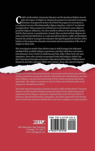 A volume in Studies in the History of Education Series Editor: Karen L. Riley, Auburn University at Montgomery Conflict and Resolution: Progressive Educators and the Question of Religion investigates the impact of religion in shaping the progressive education movement. Historians of progressivism have described the progressive movement as a secularized version of fundamentally religious impulses, a kind of 'secularized evangelicalism.' Many progressive political and social reformers were subject to powerful religious influences, but were unable to adhere to the theological tenets held by their parents or grandparents. Instead, they secularized their religious impulses and devoted themselves to social and political reform. Conflict and Resolution extends this analysis to progressive educators through biographical sketches of five leaders in the progressive education movement and an examination of the role of religion in their work. This investigation models three distinct ways in which progressive educators mediated their youthful religious experiences and their adult lives and careers. Schoolmasters Jerry Voorhis of California and Felix Adler of New York City were Integrators, those who actively incorporated firmly held religious beliefs into their educational thought and practice. Educational philosophers William Heard Kilpatrick and John Lawrence Childs were Deniers, those who rejected religious experience in their educational pursuits, but not necessarily in their personal lives. Finally, preeminent progressive educator John Dewey was a Reinterpreter, one who recast religious concepts and terminology to fit his newly emerging educational approaches. The religious experiences of each of these men left their mark on the progressive education movement. The richly textured biographical sketches found in Conflict and Resolution: Progressive Educators and the Question of Religion portray the interior lives of these figures and explain how their religious experiences impacted their work. The book will be of interest to educational historians, biographers, and others interested in the development of American education whether they come from a religious or secular mindset.