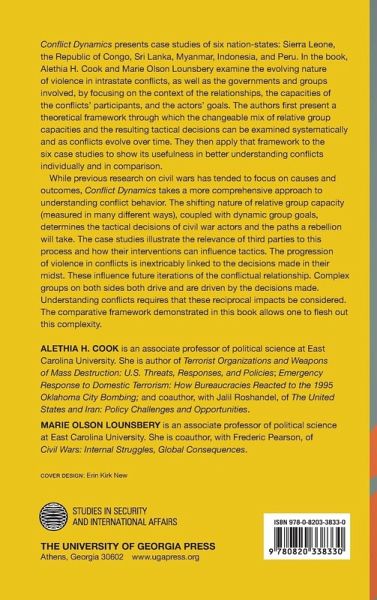 Conflict Dynamics presents case studies of six nation-states: Sierra Leone, the Republic of Congo, Sri Lanka, Myanmar, Indonesia, and Peru. In the book, Alethia H. Cook and Marie Olson Lounsbery examine the evolving nature of violence in intrastate conflicts, as well as the governments and groups involved, by focusing on the context of the relationships involved, the capacities of the conflict's participants, and the actors' goals. The authors first present a theoretical framework through which the changeable mix of relative group capacities and the resulting tactical decisions can be examined systematically and as conflicts evolve over time. They then apply that framework to the six case studies to show its usefulness in better understand-ing conflicts individually and in comparison. While previous research on civil wars has tended to focus on causes and outcomes, Conflict Dynamics takes a more comprehensive approach to understanding conflict behavior. The shifting nature of relative group capacity (measured in many different ways), coupled with dynamic group goals, determines the tactical decisions of civil war actors and the paths a rebellion will take. The case studies illustrate the relevance of third parties to this process and how their interventions can influence tactics. The progression of violence in conflicts is inextricably linked to the decisions made in their midst. These influence future iterations of the conflictual relationship. Complex groups on both sides both drive and are driven by the decisions made. Understanding conflicts requires that these reciprocal impacts be considered. The comparative frame-work demonstrated in this book allows one to flesh out this complexity.