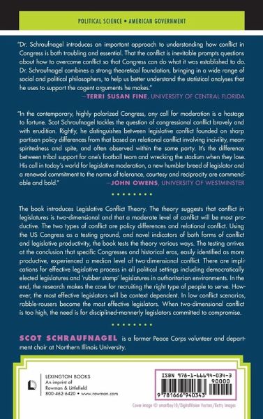 The book introduces Legislative Conflict Theory. The theory suggests that conflict in legislatures is two-dimensional and that a moderate level of conflict will be most productive. The two types of conflict are policy differences and relational conflict. Using the US Congress as a testing ground, and novel indicators of both forms of conflict and legislative productivity, the book tests the theory various ways. The testing arrives at the conclusion that specific Congresses and historical eras, easily identified as more productive, experienced a median level of two-dimensional conflict. There are implications for effective legislative process in all political settings including democratically elected legislatures and ‘rubber stamp’ legislatures in authoritarian environments. In the end, the research makes the case for recruiting the right type of people to serve. However, the most effective legislators will be context dependent. In low conflict scenarios, rabble-rousers become the most effective legislators. When two-dimensional conflict is too high, the need is for disciplined-mannerly legislators committed to compromise.