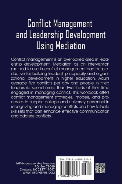 Conflict management is an overlooked area in leadership development. Mediation as an intervention method to use in conflict management can be productive for building leadership capacity and organizational development in higher education. Adults average five conflicts per day and people in titled leadership spend over two-thirds of their time engaged in managing conflict. This workbook offers conflict management strategies, models, and processes to support college and university personnel in recognizing and managing conflicts and how to build skill sets that can enhance effective communication and address conflicts.…mehr