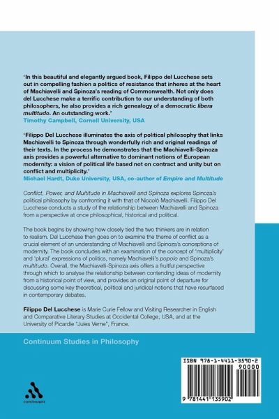 Conflict, Power and Multitude in Machiavelli and Spinoza explores Spinoza's political philosophy by confronting it with that of Niccolò Machiavelli. Filippo Del Lucchese conducts a study of the relationship between Machiavelli and Spinoza from a perspective at once philosophical, historical and political. The book begins by showing how closely tied the two thinkers are in relation to realism. Del Lucchese then goes on to examine the theme of conflict as a crucial element of an understanding of Machiavelli and Spinoza's conceptions of modernity. The book concludes with an examination of the concept of 'multiplicity' and 'plural' expressions of politics, namely Machiavelli's popolo and Spinoza's multitudo. Overall, the Machiavelli-Spinoza axis offers a fruitful perspective through which to analyse the relationship between contending ideas of modernity from a historical point of view, and provides an original point of departure for discussing some key theoretical, political and juridical notions that have resurfaced in contemporary debates.