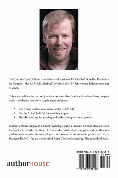 This "Just the Tools" Edition is an abbreviated version of Paul Shaffer's "Conflict Resolution for Couples - the R.I.V.E.R. Method", of which the 15th Anniversary Edition came out in 2020. This leaner edition focuses on just the core tools that Paul teaches when doing couple's work - the basics that every couple needs to know: ¿ The 5-step conflict resolution model (R.I.V.E.R.) ¿ The 26 "rules" (ABC's) for avoiding a fight ¿ Healthy routines for making and maintaining relational growth