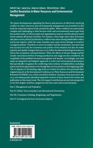 The latest developments regarding the theory and practice of effectively resolving conflict in water resources and environmental management are presented in this book by respected experts from around the globe. Water conflicts are particularly complex and challenging to solve because water and environmental issues span both the societal realm, in which people and organizations interact, and the physical world which sustains all human activities. For instance, when large-scale water diversions take place across political jurisdictions, conflicts may ensue among stakeholders within and across regions, while the water transfers may cause severe damage to sensitive ecological systems. Therefore, to arrive at realistic and fair resolutions, one must take into account not only the economics and politics of the situation but also the water quantity and quality changes that may occur within the altered hydrological system as well as the ecosystems contained therein. When the effects of climate change and the closely connected activities of energy production and usage are also considered, the complexity of the problem becomes even greater and messier. Accordingly, one must adopt an integrative and adaptive approach to water and environmental governance that specifically recognizes the conflicting value systems of stakeholders, including nature and future generations even though they are not present at the bargaining table. The 16 chapters in this leading-edge book are written by authors who presented their original research at the International Conference on Water Resources and Environment Research (ICWRER) 2013, which was held in Koblenz, Germany, from June 3rd to 7th, 2013, and subsequently submitted expanded versions of their research for review and publication in this timely book. The rich range of contributions are put into perspective in the first chapter and then categorized into four main interconnected parts: