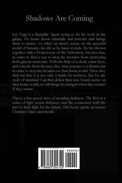 Jon Vega is a Republic Agent trying to do his work in the galaxy. He hunts down criminals and terrorist and brings them to justice. So when an attack occurs on the peaceful world of Serenity, his life as he knew it ends. He his thrown together with a Protectorate of the Federation, Nicolea Dan, in order to find a way to stop the invaders from destroying both galactic territories. With the help of a shady crime boss, and a mystic from the past, they must journey to a distant star in order to stop the invaders on their home world. There they find out that it is not only a battle for territory, but for the souls of mankind. Can they defeat their new found enemy on their home world, or will things be changed when they return? If they return. This is a fast-paced story of invading darkness. The first in a series of light versus darkness; and the connection with the past to help fight for the future. This book openly promotes Christian values and morals.