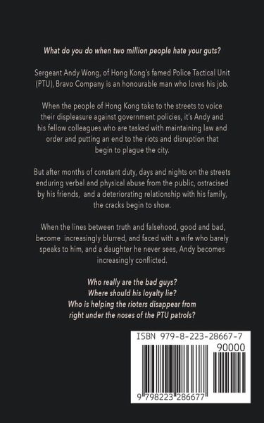 What do you do when two million people hate your guts? Sergeant Andy Wong, of Hong Kong's famed Police Tactical Unit (PTU), Bravo Company is an honourable man who loves his job. When the people of Hong Kong take to the streets to voice their displeasure against government policies, it's Andy and his fellow colleagues who are tasked with maintaining law and order and putting an end to the riots and disruption that begin to plague the city. But after months of constant duty, days and nights on the streets enduring verbal and physical abuse from the public, ostracised by his friends, and a deteriorating relationship with his family, the cracks begin to show. When the lines between truth and falsehood, good and bad, become increasingly blurred, and faced with a wife who barely speaks to him, and a daughter he never sees, Andy becomes increasingly conflicted. Who really are the bad guys? Where should his loyalty lie? Who is helping the rioters disappear from right under the noses of the PTU patrols? WHAT PEOPLE ARE SAYING ABOUT THIS SERIES: ¿¿¿¿¿ A very thrilling read. The book is put together extremely well and has everything I like in this genre. ¿¿¿¿¿ Wow. What an incredible book. You see the news , but in this story you learn a lot about the human side. Extraordinary well written, page turner, great characters. Love every minute of it. Excellent job. ¿¿¿¿¿ This is a powerful story. ¿¿¿¿¿ An excellent, exciting and well written book that took me back to the many years I lived in HK-Clearly the author has had experience at living in HK too and has used this to best sell the story-well done and I look forward to the next book in this theme. ¿¿¿¿¿ An incredible book by this talented author. The mix of fiction and the current reality of life in Hong Kong delivers a powerful story.