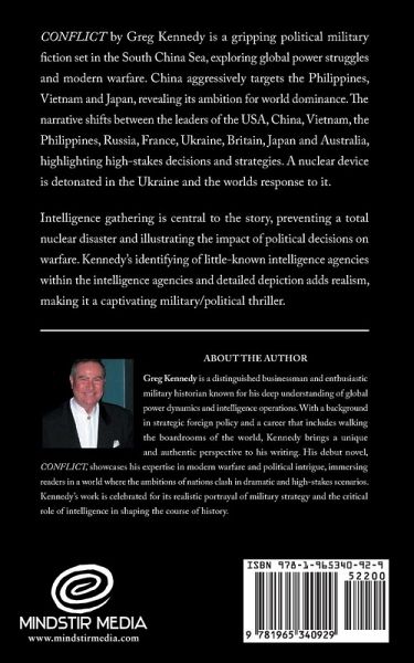 "CONFLICT" by Greg Kennedy is a gripping political military fiction that delves deep into the intricacies of global power struggles and the ever-evolving nature of warfare. Set against the backdrop of the South China Sea, this novel offers a panoramic view of a world on the brink of catastrophe. This book is timely. The story unfolds with China launching an aggressive campaign against its neighbouring countries-first targeting the Philippines, then Vietnam, and Japan. As the conflict escalates, the ambition of the Chinese leadership becomes clear: world dominance. The narrative shifts between the perspectives of key global leaders, including the Presidents of the USA, China, Vietnam, the Philippines, Russia, France, Ukraine and the Prime Ministers of Britain, Japan and Australia. The reader is taken on a journey through war rooms and covert operations, revealing the high-stakes decisions and strategies that shape the course of history. The South China Sea becomes the epicentre of the conflict, where naval battles and aerial dogfights ensue. The climax of the story occurs when China faces a critical defeat in the South China Sea. In a desperate bid for victory, China attempts to deploy a nuclear device against the United States. However, this catastrophic plan fails, marking a turning point in the war. The resolution comes with a dramatic twist: the Vice-President of China inform the Americans that the Chinese President has died, signalling an unexpected shift in the political landscape. This revelation opens the door for negotiations and a possible end to the hostilities. Throughout the novel, the theme of intelligence gathering is prominently featured. It is through the meticulous work of intelligence agencies that crucial information is uncovered, ultimately leading to the prevention of the nuclear disaster and the eventual downfall of the Chinese aggression. Greg Kennedy's deep understanding of intelligence operations provides a unique and authentic perspective, challenging the reader to keep pace with the fast-moving and ever-changing scenarios. Central to the narrative is the exploration of how political decisions dramatically influence the nature of war. The book intricately details how the calculations and miscalculations of world leaders can escalate conflicts or pave the way for peace. Political manoeuvres, alliances, and betrayals shape the strategies on the ground and the fate of nations, demonstrating that warfare is as much a battle of minds as it is of might. With a descriptive tone and a style that immerses the reader in the tension and urgency of global conflict, "CONFLICT" stands out for its detailed portrayal of modern warfare and political manoeuvring. Kennedy's identifying little known intelligence services within the intelligence agencies adds a layer of authenticity that will captivate readers who crave a realistic and thought-provoking military thriller. The synopsis emphasizes the critical role of political decisions in shaping the course of war and state affairs.