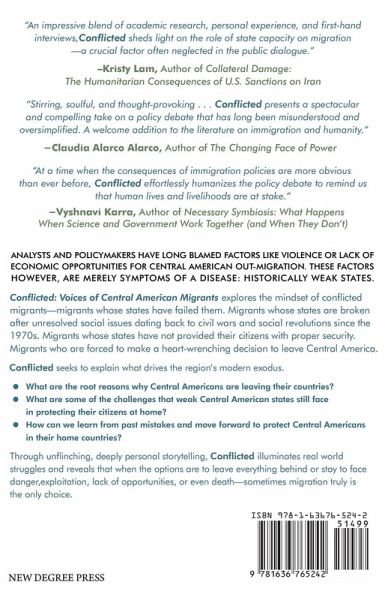 Analysts and policymakers have long blamed factors like violence or lack of economic opportunities for Central American out-migration. These factors, however, are merely symptoms of a disease: historically weak states. Conflicted: Voices of Central American Migrants explores the mindset of conflicted migrants-migrants whose states have failed them. Migrants whose states are broken after unresolved social issues dating back to civil wars and social revolutions since the 1970s. Migrants whose states have not provided their citizens with proper security. Migrants who are forced to make a heart-wrenching decision to leave Central America. Conflicted seeks to explain what drives the region's modern exodus.What are the root reasons why Central Americans are leaving their countries? What are some of the challenges that weak Central American states still face in protecting their citizens at home? How can we learn from past mistakes and move forward to protect Central Americans in their home countries? Through unflinching, deeply personal storytelling, Conflicted illuminates real world struggles and reveals that when the options are to leave everything behind or stay to face danger, exploitation, lack of opportunities, or even death-sometimes migration truly is the only choice.