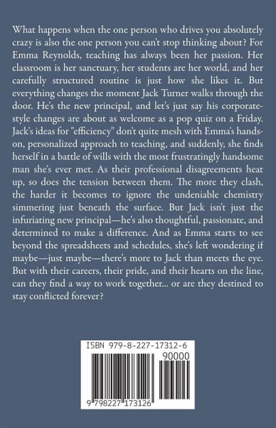 What happens when the one person who drives you absolutely crazy is also the one person you can't stop thinking about? For Emma Reynolds, teaching has always been her passion. Her classroom is her sanctuary, her students are her world, and her carefully structured routine is just how she likes it. But everything changes the moment Jack Turner walks through the door. He's the new principal, and let's just say his corporate-style changes are about as welcome as a pop quiz on a Friday. Jack's ideas for "efficiency" don't quite mesh with Emma's hands-on, personalized approach to teaching, and suddenly, she finds herself in a battle of wills with the most frustratingly handsome man she's ever met. As their professional disagreements heat up, so does the tension between them. The more they clash, the harder it becomes to ignore the undeniable chemistry simmering just beneath the surface. But Jack isn't just the infuriating new principal-he's also thoughtful, passionate, and determined to make a difference. And as Emma starts to see beyond the spreadsheets and schedules, she's left wondering if maybe-just maybe-there's more to Jack than meets the eye. But with their careers, their pride, and their hearts on the line, can they find a way to work together... or are they destined to stay conflicted forever?