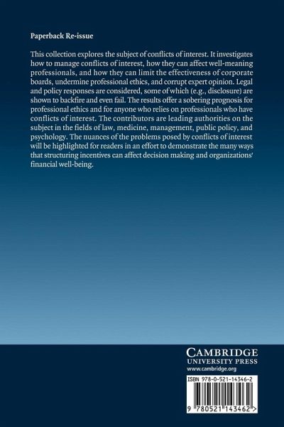 This collection explores the subject of conflicts of interest. It investigates how to manage conflicts of interest, how they can affect well-meaning professionals, and how they can limit the effectiveness of corporate boards, undermine professional ethics, and corrupt expert opinion. Legal and policy responses are considered, some of which (e.g. disclosure) are shown to backfire and even fail. The results offer a sobering prognosis for professional ethics and for anyone who relies on professionals who have conflicts of interest. The contributors are leading authorities on the subject in the fields of law, medicine, management, public policy, and psychology. The nuances of the problems posed by conflicts of interest will be highlighted for readers in an effort to demonstrate the many ways that structuring incentives can affect decision making and organizations' financial well-being.