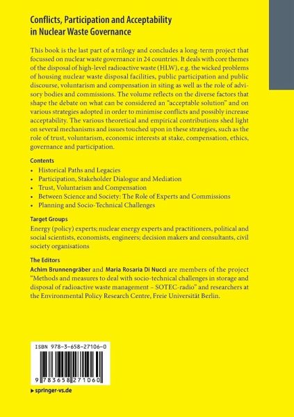 This book is the last part of a trilogy and concludes a long-term project that focussed on nuclear waste governance in 24 countries. It deals with core themes of the disposal of high-level radioactive waste (HLW), e.g. the wicked problems of housing nuclear waste disposal facilities, public participation and public discourse, voluntarism and compensation in siting as well as the role of advisory bodies and commissions. The volume reflects on the diverse factors that shape the debate on what can be considered an "acceptable solution" and on various strategies adopted in order to minimise conflicts and possibly increase acceptability. The various theoretical and empirical contributions shed light on several mechanisms and issues touched upon in these strategies, such as the role of trust, voluntarism, economic interests at stake, compensation, ethics, governance, and participation.