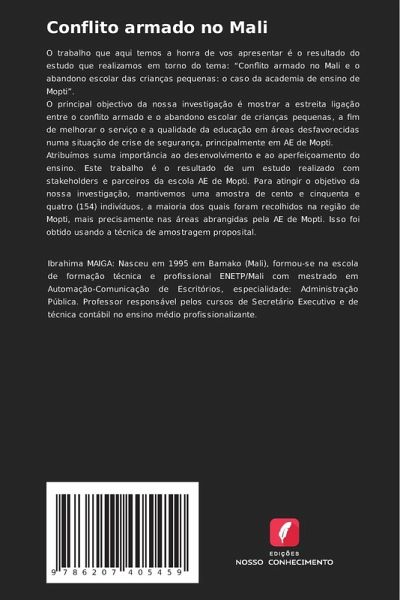 O trabalho que aqui temos a honra de vos apresentar é o resultado do estudo que realizamos em torno do tema: ¿Conflito armado no Mali e o abandono escolar das crianças pequenas: o caso da academia de ensino de Mopti¿.O principal objectivo da nossa investigação é mostrar a estreita ligação entre o conflito armado e o abandono escolar de crianças pequenas, a fim de melhorar o serviço e a qualidade da educação em áreas desfavorecidas numa situação de crise de segurança, principalmente em AE de Mopti.Atribuímos suma importância ao desenvolvimento e ao aperfeiçoamento do ensino. Este trabalho é o resultado de um estudo realizado com stakeholders e parceiros da escola AE de Mopti. Para atingir o objetivo da nossa investigação, mantivemos uma amostra de cento e cinquenta e quatro (154) indivíduos, a maioria dos quais foram recolhidos na região de Mopti, mais precisamente nas áreas abrangidas pela AE de Mopti. Isso foi obtido usando a técnica de amostragem proposital.