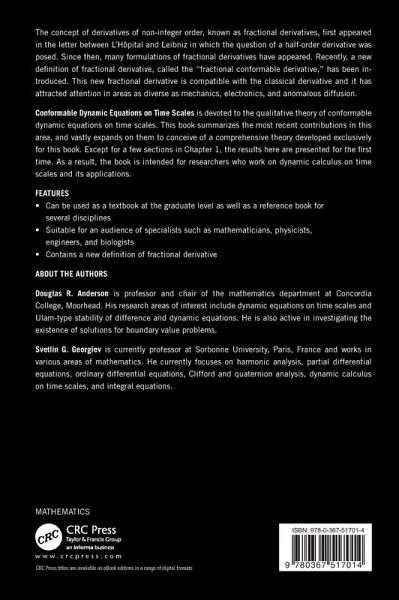 1. Conformable Dynamic Calculus on Time Scales. 2. First Order Linear Dynamic Equations. 3. Conformable Dynamic Systems on Time Scales. 4. Linear Conformable Inequalities. 5. Cauchy Type Problem for a Class Nonlinear Conformable Dynamic Equations. 6. Higher Order Linear Conformable Dynamic Equations with Constant Coefficients. 7. Second Order Conformable Dynamic Equations. 8. Second-Order Self-Adjoint Conformable Dynamic Equations. 9. The Conformable Laplace Transform. Appendix A. Derivatives on Banach Spaces. Appendix B. A Chain Rule.