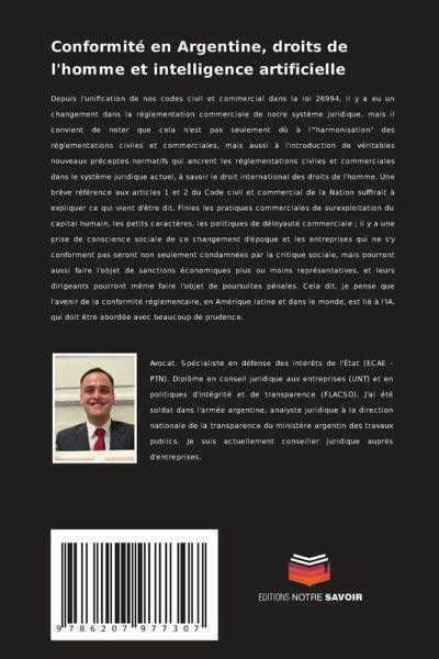 Depuis l'unification de nos codes civil et commercial dans la loi 26994, il y a eu un changement dans la réglementation commerciale de notre système juridique, mais il convient de noter que cela n'est pas seulement dû à l'"harmonisation" des réglementations civiles et commerciales, mais aussi à l'introduction de véritables nouveaux préceptes normatifs qui ancrent les réglementations civiles et commerciales dans le système juridique actuel, à savoir le droit international des droits de l'homme. Une brève référence aux articles 1 et 2 du Code civil et commercial de la Nation suffirait à expliquer ce qui vient d'être dit. Finies les pratiques commerciales de surexploitation du capital humain, les petits caractères, les politiques de déloyauté commerciale ; il y a une prise de conscience sociale de ce changement d'époque et les entreprises qui ne s'y conforment pas seront non seulement condamnées par la critique sociale, mais pourront aussi faire l'objet de sanctions économiques plus ou moins représentatives, et leurs dirigeants pourront même faire l'objet de poursuites pénales. Cela dit, je pense que l'avenir de la conformité réglementaire, en Amérique latine et dans le monde, est lié à l'IA, qui doit être abordée avec beaucoup de prudence.
