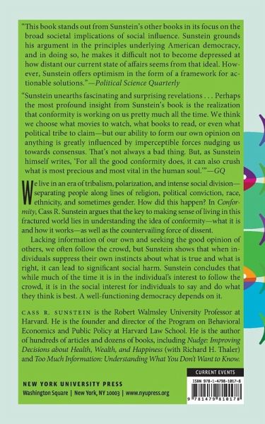 Bestselling author Cass R. Sunstein reveals the appeal and the danger of conformity We live in an era of tribalism, polarization, and intense social division-separating people along lines of religion, political conviction, race, ethnicity, and sometimes gender. How did this happen? In Conformity, Cass R. Sunstein argues that the key to making sense of living in this fractured world lies in understanding the idea of conformity-what it is and how it works-as well as the countervailing force of dissent. An understanding of conformity sheds new light on many issues confronting us today: the role of social media, the rise of fake news, the growth of authoritarianism, the success of Donald Trump, the functions of free speech, debates over immigration and the Supreme Court, and much more. Lacking information of our own and seeking the good opinion of others, we often follow the crowd, but Sunstein shows that when individuals suppress their own instincts about what is true and what is right, it can lead to significant social harm. While dissenters tend to be seen as selfish individualists, dissent is actually an important means of correcting the natural human tendency toward conformity and has enormous social benefits in reducing extremism, encouraging critical thinking, and protecting freedom itself. Sunstein concludes that while much of the time it is in the individual's interest to follow the crowd, it is in the social interest for individuals to say and do what they think is best. A well-functioning democracy depends on it.