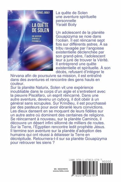Moi, Piscéfaro, je vous raconte une confrontation idéologique existentielle entre deux personnages, dont l'un vous est familier. Un certain rebelle de la Palestine, il y a plus de deux mille ans, croyait son dieu parfait jusqu'à sa rencontre avec mon ami Solen. Ce jeune adolescent de la planète Gouapizyma s'est noyé dans l'océan. Il a été par la suite réincarné sur différents astres. Une fois sur la Terre. Je vous raconte son histoire, ses relations sentimentales, ses découvertes sensationnelles et parfois troublantes et ses mésaventures. Ses joies et ses souffrances. Et la raison de son affrontement avec Jésus.