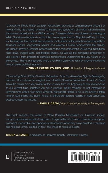 This book uses a quantitative-statistical approach to examine the impact of the White Christian nationalist movement on American society, focusing on its influence on social institutions. Why has a plurality of citizens in the US supported nationalistic, inequitable, oppressive political philosophies? Chuck A. Baker argues that citizens become more receptive to nationalism when it is presented in racialized and religious terms, when racial and religious segregation is made acceptable by invoking fear that forces citizens to choose and accept a zero sum perception of winning for their survival, and by tying it to a religious context makes ethnic nationalism less unpleasant through the implication that it is divinely ordained. By exploring the interaction between ethnic nationalism and Christian nationalism and in a variety of social institutions including government, media, education, military, and economy, Chuck A. Baker reveals the justifications and rationalizations that contribute to making right-wing politics appealing to some people.