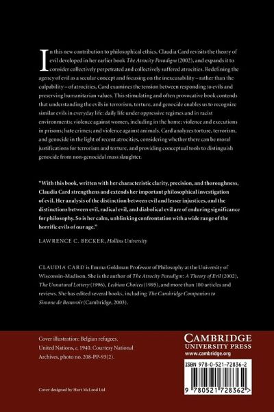 In this contribution to philosophical ethics, Claudia Card revisits the theory of evil developed in her earlier book The Atrocity Paradigm (2002), and expands it to consider collectively perpetrated and collectively suffered atrocities. Redefining evil as a secular concept and focusing on the inexcusability - rather than the culpability - of atrocities, Card examines the tension between responding to evils and preserving humanitarian values. This stimulating and often provocative book contends that understanding the evils in terrorism, torture and genocide enables us to recognise similar evils in everyday life: daily life under oppressive regimes and in racist environments; violence against women, including in the home; violence and executions in prisons; hate crimes; and violence against animals. Card analyses torture, terrorism and genocide in the light of recent atrocities, considering whether there can be moral justifications for terrorism and torture, and providing conceptual tools to distinguish genocide from non-genocidal mass slaughter.