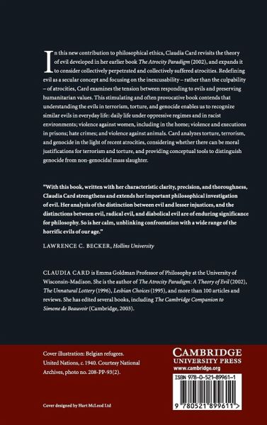 In this contribution to philosophical ethics, Claudia Card revisits the theory of evil developed in her earlier book The Atrocity Paradigm (2002), and expands it to consider collectively perpetrated and collectively suffered atrocities. Redefining evil as a secular concept and focusing on the inexcusability - rather than the culpability - of atrocities, Card examines the tension between responding to evils and preserving humanitarian values. This stimulating and often provocative book contends that understanding the evils in terrorism, torture and genocide enables us to recognise similar evils in everyday life: daily life under oppressive regimes and in racist environments; violence against women, including in the home; violence and executions in prisons; hate crimes; and violence against animals. Card analyses torture, terrorism and genocide in the light of recent atrocities, considering whether there can be moral justifications for terrorism and torture, and providing conceptual tools to distinguish genocide from non-genocidal mass slaughter.