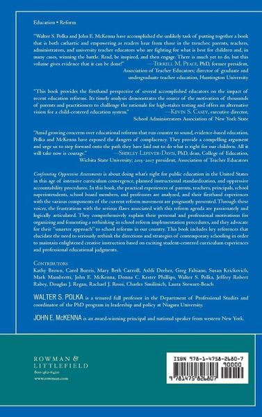 Foreword Preface: Confronting Oppressive Assessments: How Parents, Educators, and Policy-Makers Are Rethinking Current Educational Reforms Walter S. Polka and John McKenna Chapter One: What Are We Really Doing to our Children? Rethinking Federal and State Education Reform Policies Walter S. Polka and John E. McKenna Chapter Two: Using an Industrial Age Paradigm for Education is Not Smart, Especially in the Digital Age John E. McKenna and Walter S. Polka Chapter Three:The Lack of Joy in Learning: Parents Want to Know Why Children Don't Like School Anymore Douglas J. Regan and Mary Beth Carroll Chapter Four: Why Teachers Are Frustrated Ashli Dreher and Kathy Brown Chapter Five: High-Stakes Test Anxieties for All Children: Parents, Teachers, and Pscyhologists Voice Concerns Laura Stewart-Beach, Kathy Brown, and Greg Fabiano Chapter Six:Principals with Principles: The Dilemma of Implementing Destructive Polices Charles Smilinich, Mark Mambretti, Douglas Regan, and John McKenna Chapter Seven: Superintendents' Perspectives: Fighting for Local Control and Justice in Education for All Jeffrey Robert Rabey Chapter Eight: Thoughts on What to Do Next at the Local Level John McKenna and Walter Polka Chapter Nine: A Dwindling Second Chance: High School Dropouts and the 2014 GED® Exam Rachael J. Rossi Chapter Ten: Everyone is Now a "Teacher of the Core"-Even Higher Education is Converged in This Reform Movement Susan Krickovich and Donna Phillips Chapter Eleven: Political Perspectives Regarding Changing the Current Educational Reform Agenda: The Winds of Change are Blowing Stronger Walter S. Polka and John E. McKenna Chapter Twelve: Why Not Create a Brighter Future for All of Our Students by Legislative Changes to the Educational Current Reforms? What If We Just Do It? John E. McKenna and Walter S. Polka Appendix About the Editors About the Contributors