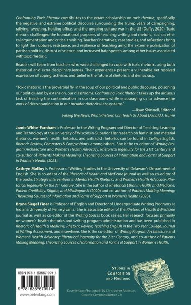 Confronting Toxic Rhetoric contributes to the extant scholarship on toxic rhetoric, specifically the negative and extreme political discourse surrounding the Trump years of campaigning, rallying, tweeting, holding office, and the ongoing culture war in the US (Duffy, 2020). Toxic rhetoric challenged the foundational purposes of teaching writing and rhetoric, such as ethical argumentation and critical thinking. Teachers' narratives, case studies, and reflections bring to light the ruptures, resistance, and resilience of teaching amid the extreme polarization of partisan politics, distrust of science, and increased hate speech, among other issues associated with toxic rhetoric.