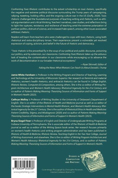 Confronting Toxic Rhetoric contributes to the extant scholarship on toxic rhetoric, specifically the negative and extreme political discourse surrounding the Trump years of campaigning, rallying, tweeting, holding office, and the ongoing culture war in the US (Duffy, 2020). Toxic rhetoric challenged the foundational purposes of teaching writing and rhetoric, such as ethical argumentation and critical thinking. Teachers' narratives, case studies, and reflections bring to light the ruptures, resistance, and resilience of teaching amid the extreme polarization of partisan politics, distrust of science, and increased hate speech, among other issues associated with toxic rhetoric.