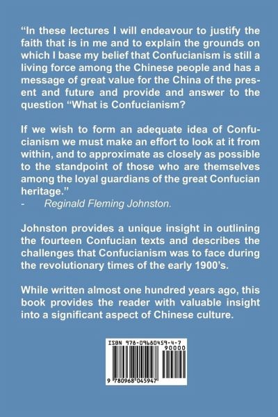 "In these lectures I will endeavour to justify the faith that is in me and to explain the grounds on which I base my belief that Confucianism is still a living force among the Chinese people and has a message of great value for the China of the present and future and provide and answer to the question "What is Confucianism? If we wish to form an adequate idea of Confucianism we must make an effort to look at it from within, and to approximate as closely as possible to the standpoint of those who are themselves among the loyal guardians of the great Confucian heritage." -Reginald Fleming Johnston. Johnston provides a unique insight in outlining the fourteen Confucian texts and describes the challenges that Confucianism was to face during the revolutionary times of the early 1900's. While written almost one hundred years ago, this book provides the reader with valuable insight into a significant aspect of Chinese culture.
