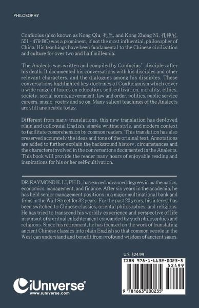 Confucius (also known as Kong Qiu, , and Kong Zhong Ni, , 551 - 479 BC) was a prominent, if not the most influential, philosopher of China. His teachings have been fundamental to the Chinese civilization and culture for over two and half millennia. The Analects was written and compiled by Confucius' disciples after his death. It documented his conversations with his disciples and other relevant characters, and the dialogues among his disciples. These conversations highlighted key doctrines of Confucianism which cover a wide range of topics on education, self-cultivation, morality, ethics, society, social norms, government, law and order, politics, public service careers, music, poetry and so on. Many salient teachings of the Analects are still applicable today. Different from many translations, this new translation has deployed plain and colloquial English, simple writing style, and modern context to facilitate comprehension by common readers. This translation has also preserved accurately the ideas and tone of the original text. Annotations are added to further explain the background history, circumstances and the characters involved in the conversations documented in the Analects. This book will provide the reader many hours of enjoyable reading and inspirations for his or her self-cultivation.