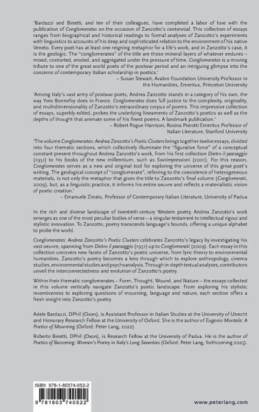 Contents: Conglomerate 1: Form - Nicola Gardini: Figura: A Word by Andrea Zanzotto - Giulia Martini: A, b, c, d, e, Polifemo: On IX Ecloghe's Dialogism - Andrea di Serego Alighieri: 'Diffidare il corpo far svenire di fame ogni gesto': Tracing Andrea Zanzotto's Poetics of Delivery - Conglomerate 2: Thought - Stefano Dal Bianco: Andrea Zanzotto's Archetypical Symbolism - Francesco Venturi: The 'Rotating Field' of Andrea Zanzotto's Trilogy - Emanuele Zoppellari: 'Rune forse lunari': Andrea Zanzotto's vecio parlar and Venetic Mythology - Conglomerate 3: Wound - Gian Maria Annovi: Trembling Lines: Drawing, Trauma and Writing in Andrea Zanzotto's Conglomerati - Adele Bardazzi : 'Rivolgersi agli ossari': Zanzotto's Poetics of Mourning Against Humanity - Roberto Binetti: The Exhausted Language of Poetry: Reading Zanzotto with Deleuze Through Beckett - Conglomerate 4: Nature - Matilde Manara: Outraging Nature. Zanzotto's and Tarkovsky's Nonplaces Between Wasted Arcadia and Landscape's Revenge - Francesca Santucci: Zanzotto's Bestiary and the Post-Human - Daria Catulini: The Haiku's Seasons: A Path to Understanding Zanzotto's Late Poetry.