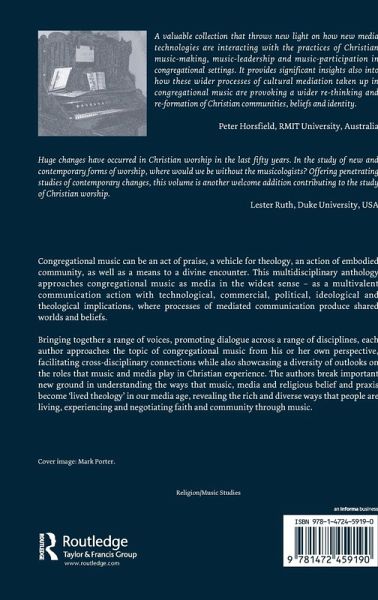 Congregational music can be an act of praise, a vehicle for theology, an action of embodied community, as well as a means to a divine encounter. This multidisciplinary anthology approaches congregational music as media in the widest sense - as a multivalent communication action with technological, commercial, political, ideological and theological implications, where processes of mediated communication produce shared worlds and beliefs. Bringing together a range of voices, promoting dialogue across a range of disciplines, each author approaches the topic of congregational music from his or her own perspective, facilitating cross-disciplinary connections while also showcasing a diversity of outlooks on the roles that music and media play in Christian experience. The authors break important new ground in understanding the ways that music, media and religious belief and praxis become 'lived theology' in our media age, revealing the rich and diverse ways that people are living, experiencing and negotiating faith and community through music.