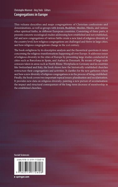This volume describes and maps congregations of Christian confessions and denominations, as well as groups with Jewish, Buddhist, Muslim, Hindu, and various other spiritual faiths, in different European countries. Consisting of three parts, it presents concrete sociological studies addressing how established and not established, old and new congregations of various faiths create a new kind of religious diversity at the country level; how religious congregations are challenged and thrive in large cities; and how religious congregations change in the 21st century. The book enlightens by its descriptive analysis and the theoretical questions it raises concerning the religious transformations happening all over Europe. It addresses issues of religious diversity in the cities of Europe by presenting large studies conducted in cities such as Barcelona in Spain, and Aarhus in Denmark. By means of large-scale censuses taken in areas such as North Rhine-Westphalia in Germany and in countries like Switzerland and Italy, the book shows how the historically established churches restructure their congregations and activities. It clarifies for the new gatherers where and how a new diversity of religious congregations is in the process of being established. Finally, the book covers two important topical issues: pluralisation and secularisation. It provides new data on religious diversity, painting a new picture of secularisation: the impact and structural consequences of the long-term decrease of membership in the established churches.