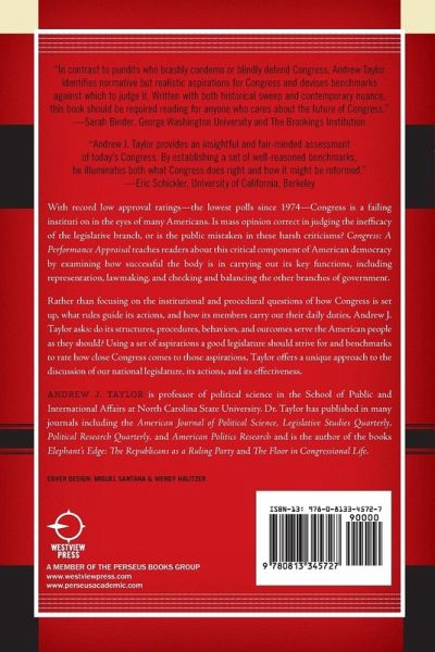 With record low approval ratings (the lowest poll results since 1974) Congress is a failing institution in the eyes of many Americans. Is public opinion correct in judging the inefficacy of the legislative branch, or is the public mistaken in these harsh criticisms? Congress: A Performance Appraisal teaches students about this critical institution of American democracy by examining how successful the body is in carrying out its key functions, particularly representation, lawmaking, and checking the other branches of government. Rather than focusing on the institutional and procedural questions of how Congress is set up, what rules guide its actions, and how its members carry out their daily duties, Andrew J. Taylor asks: do these structures, procedures, behaviors, and outcomes serve the American people as they were meant to? Using a set of aspirations a good legislature should strive for and benchmarks to rate how close it comes to those aspirations, Taylor offers a unique approach to the discussion of Congress, its actions, and its efficacy as a legislature. Sure to prompt provocative classroom discussions, Congress is the perfect text for courses on American government and politics.