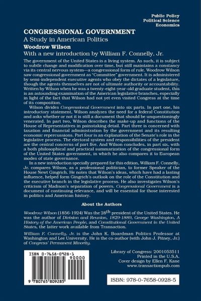 The government of the United States is a living system. As such, it is subject to subtle change and modification over time, but still maintains a constancy via its central nervous system-a congressional form of rule. Woodrow Wilson saw congressional government as "Committee" government. It is administered by semi-independent executive agents who obey the dictates of a legislature, though the agents themselves are not of ultimate authority or accountability. Written by Wilson when he was a twenty-eight-year-old graduate student, this is an astounding examination of the American legislative branches, especially in light of the fact that Wilson had not yet even visited Congress at the time of its composition.Wilson divides Congressional Government into six parts. In part one, his introductory statement, Wilson analyzes the need for a federal Constitution and asks whether or not it is still a document that should be unquestioningly venerated. In part two, Wilson describes the make-up and functions of the House of Representatives in painstaking detail. Part three is concerned with taxation and financial administration by the government and its resulting economic repercussions. Part four is an explanation of the Senate's role in the legislative process. The electoral system and responsibilities of the president are the central concerns of part five. And Wilson concludes, in part six, with a both philosophical and practical summarization of the congressional form of the United States government, in which he also compares it to European modes of state governance.In a new introduction specially prepared for this edition, William F. Connelly, Jr. compares Wilson, as a professional politician, to former Speaker of the House Newt Gingrich. He notes that Wilson's ideas, which have had a lasting influence, helped form Gingrich's outlook on the role of the Constitution and the executive branch in the legislative process. He also investigates Wilson's criticism of Madison's separation of powers. Congressional Government is a document of continuing relevance, and will be essential for those interested in politics and American history.