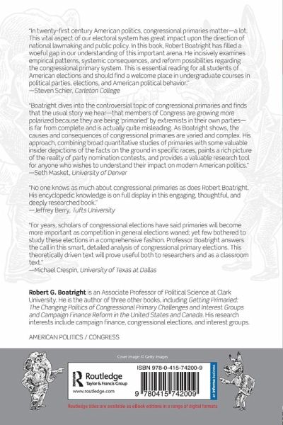 Congressional primaries are increasingly being blamed for polarization and gridlock in Congress. Most American states adopted congressional primaries during the first decades of the 20th century as a means of breaking the hold of political "bosses" on the nomination of candidates. Yet now, many contend that primaries have become a means by which the most dedicated party activists choose candidates unrepresentative of the electorate, and so general election voters are forced to choose between two ideologically extreme candidates. Consequently, there have been recent instances in both parties where nominees were chosen who were clearly not preferred by party leaders, and who arguably lost elections that their parties should have won. This book is the first to focus solely upon congressional primary elections, and to do so for a student readership. Boatright organizes his text around the contention that there are important differences between types of primaries, and these differences prevent us from making blanket statements about primary competition. He focuses on explanations of two sources of difference: differences in electoral structure and differences brought about by the presence or absence of an incumbent seeking reelection. The first three chapters introduce these differences, explore how they came to exist, and outline some of the strategic considerations for candidates, parties, interest groups, and voters in primary elections. The subsequent four chapters explore different types of primary elections, and the final chapter evaluates actual and proposed primary reforms. Congressional Primary Elections is the first book to provide a history and analysis of congressional primary elections and will serve as a crucial part of courses on political parties and campaigns and elections. The book gives students the tools for understanding arguments for and against the reform of primary elections and for understanding the differences between types of primaries.