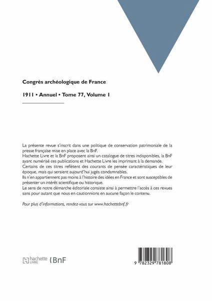 Congrès archéologique de France: séances générales tenues ... par la Société française pour la conservation des monuments historiques Date de l'édition originale: 1911 La présente revue s'inscrit dans une politique de conservation patrimoniale de la presse française mise en place avec la BnF. Hachette Livre et la BnF proposent ainsi un catalogue de titres indisponibles, la BnF ayant numérisé ces publications et Hachette Livre les imprimant à la demande. Certains de ces titres reflètent des courants de pensée caractéristiques de leur époque, mais qui seraient aujourd'hui jugés condamnables. Ils n'en appartiennent pas moins à l'histoire des idées en France et sont susceptibles de présenter un intérêt scientifique ou historique. Le sens de notre démarche éditoriale consiste ainsi à permettre l'accès à ces revues sans pour autant que nous en cautionnions en aucune façon le contenu. Pour plus d'informations, rendez-vous sur www.hachettebnf.fr